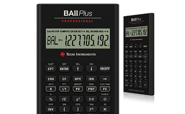 - kalkulator finansowy TI BA II PLUS PROFESSIONAL dopuszczony do egzaminów m.in. na doradcę inwestycyjnego oraz CFA, pomocny także w codziennych obliczeniach inwestycyjnych lub biznesowych